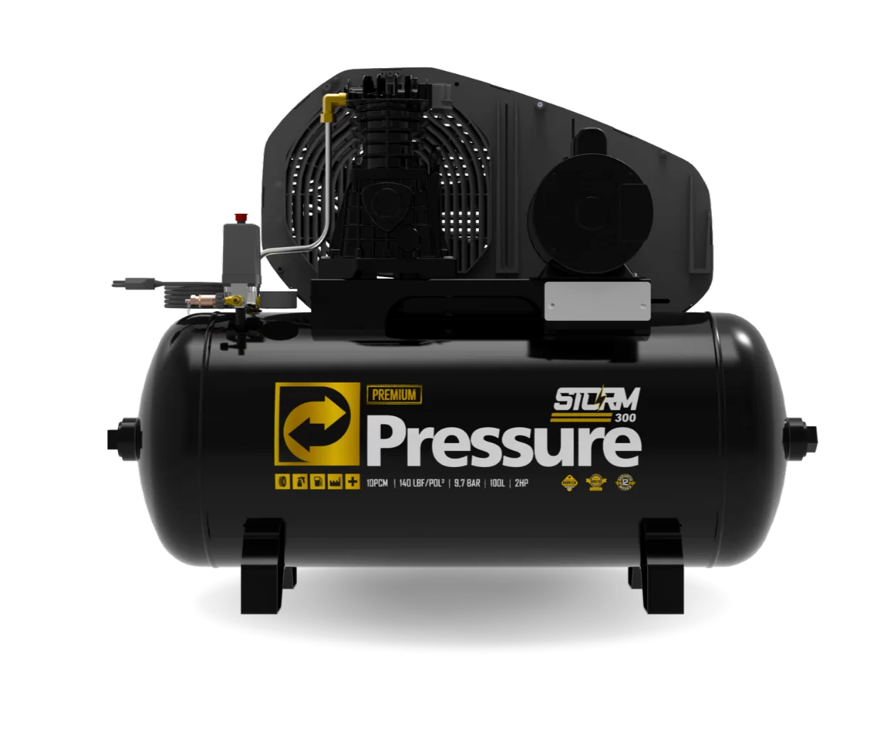 Este compressor possui tanque de 100 litros e suporta pressão máxima de 10 bar. O motor é desenhado para trabalhar de forma eficiente e contínua, o que facilita o uso em bicicletas, veículos e equipamentos pneumáticos. Seu formato compacto facilita o manuseio e armazenamento, sem perder a robustez necessária para trabalho pesado.