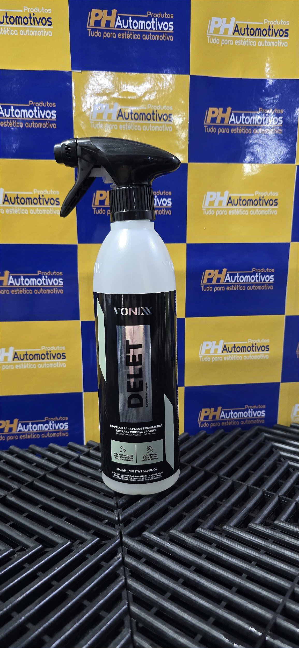 DELET é um limpador de alta performance, formulado exclusivamente para remover sujidade severa em pneus e borrachas, garantindo total limpeza,devolvendo originalidade e sem deixar aspecto acinzentado. Essa limpeza ajudará a melhorar a performance dos produtos para condicionar os pneus.