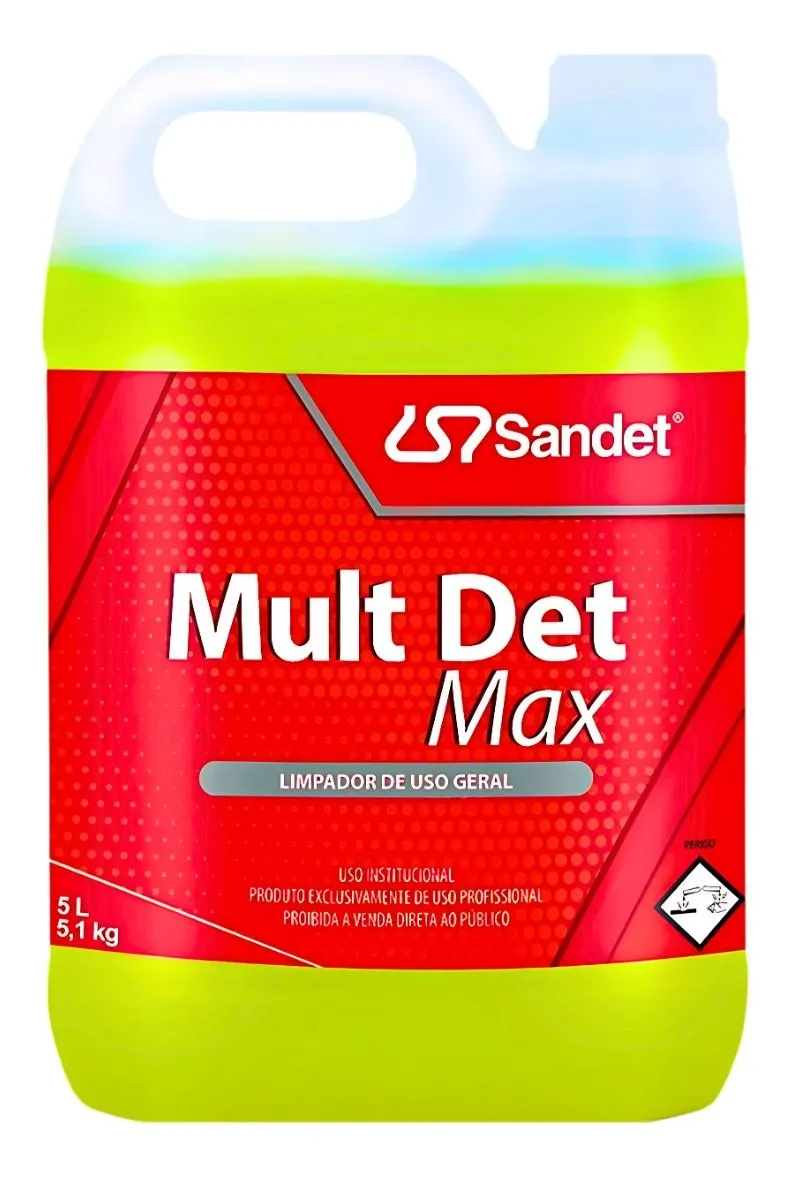O MULTDET MAX 5 litros da Sandet é um limpador multiuso profissional indicado para o uso institucional e residencial. Sua fórmula concentrada oferece alta eficiência na remoção de sujeiras pesadas em diversas superfícies, garantindo limpeza profunda e brilho. Ideal para pisos, azulejos e áreas comuns, o produto é fácil de aplicar e promove a higienização rápida e eficaz. Seu grande volume atende desde pequenos ambientes até grandes áreas, otimizando o custo-benefício do processo de limpeza.